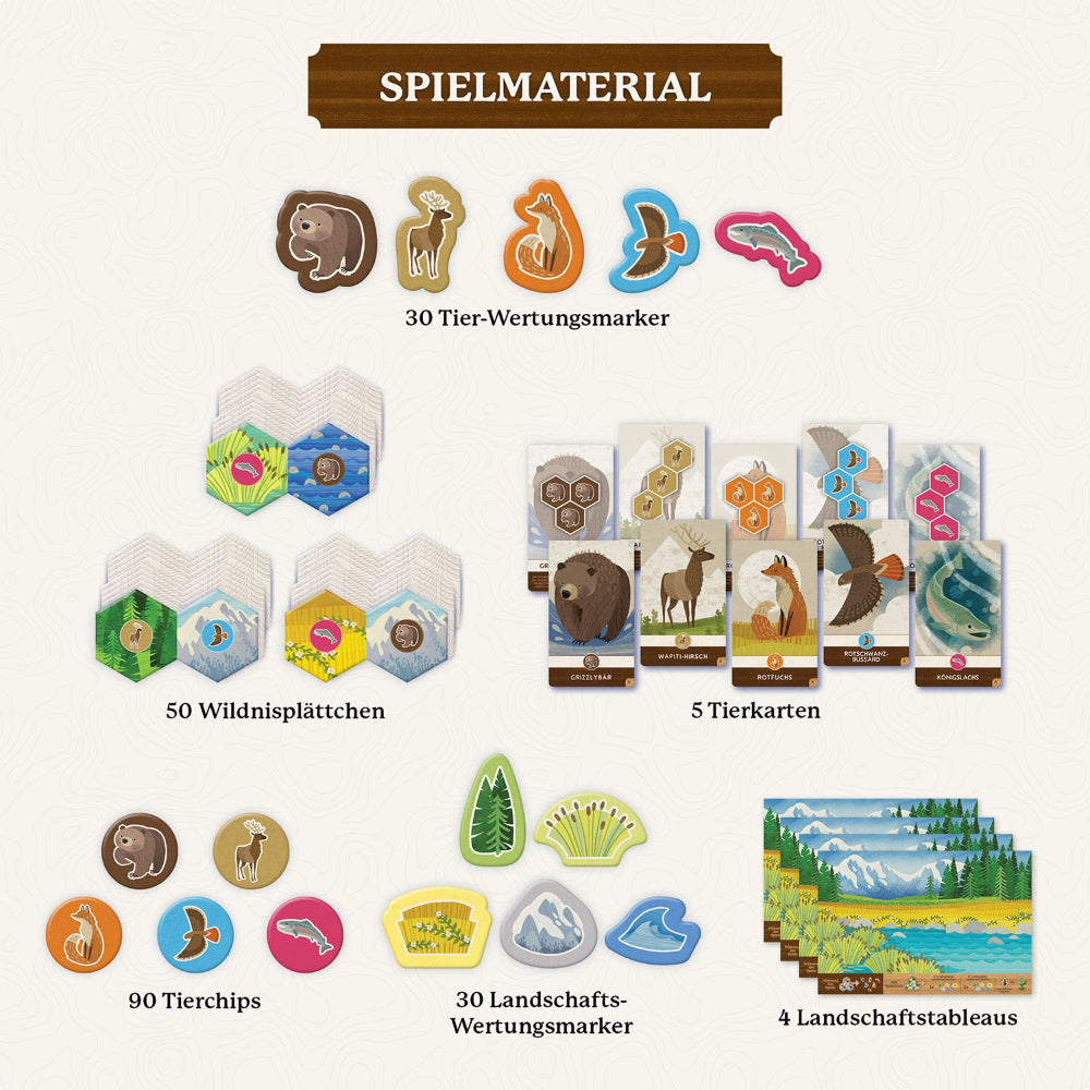 Hirsche, Füchse, Bussarde, Lachse, Bären: viele Wildtiere leben in Cascadia. Ihre Heimat soll noch schöner und größer werden! Um den Lebensraum weiter auszubauen und zu gestalten, werden geeignete Wildnis-Plättchen ausgesucht und an der richtigen Stelle angelegt. Liegen drei gleiche Tiersymbole nebeneinander, können die Tiere in die eigene Landschaft der Spielerin oder des Spielers umziehen.