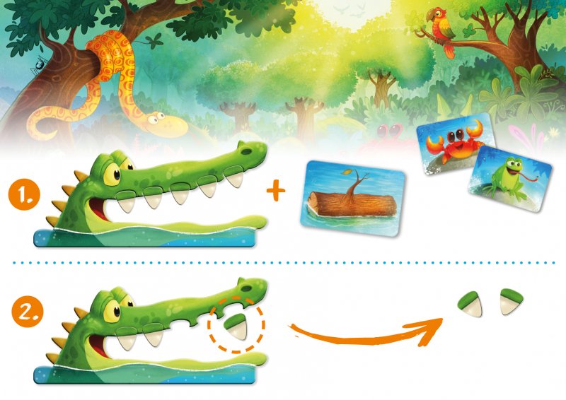 Jedes Kind bekommt ein Krokodil und geht damit auf Jagd. Das Rad im Fluss mit den tierisch-leckeren Snacks dreht sich vor euren Augen. Sobald ihr es mit eurem Kroko stoppt, dürft ihr eine Karte bei jemanden ziehen. Ist es ein Snack, nehmt ihr die Karte auf die Hand. Erwischt ihr aber einen Baumstamm, verliert ihr einen Zahn! Hat euer Kroko ein Tier im Strudel erwischt, das ihr bereits als Karte auf der Hand habt? Dann dürft ihr die Karte ablegen und das Tier fressen.