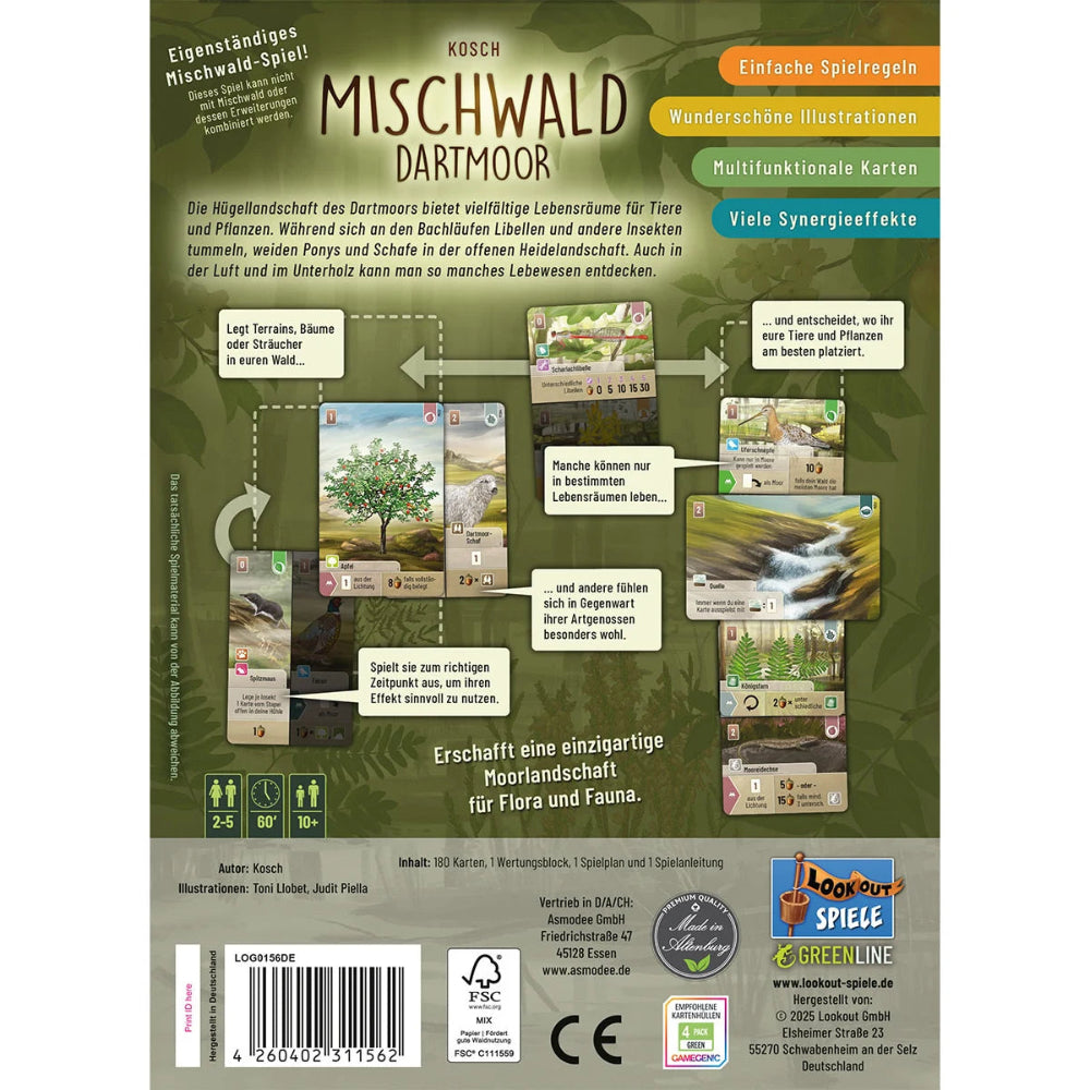 Im Kartensammelspiel Mischwald: Dartmoor erschafft Ihr ein harmonisches Ökosystem in den weitläufigen Moor- und Heidelandschaften des Dartmoor Nationalparks. Neben Bäumen und Sträuchern bringt diese Edition Geländekarten ins Spiel, die quer ausgelegt werden und neue Lebensräume oder Futterstellen für seltene Tier- und Pflanzenarten bieten. Mit reduzierter Symbolik für schnelleren Spielfluss und neuen Arten mit einzigartigen Fähigkeiten bietet diese Version einen noch angenehmeren Einstieg.