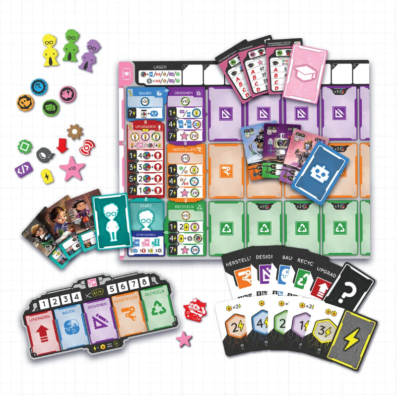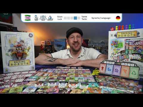 Raising Robots ist ein kompetitives Engine-Building-Spiel. Ihr wählt gleichzeitig zwei oder mehr Aktionen aus und führt sie aus: Aufrüsten, Zusammenbauen, Entwerfen, Herstellen, Recyceln. Jede Aktion wird mit einer variablen Menge an Energie ausgeführt, um sie besser oder schlechter zu machen. Die stärksten Aktionen helfen aber auch deinen Gegnern, handelt also mit Bedacht. Wer nach acht Runden die meisten Punkte hat, gewinnt.