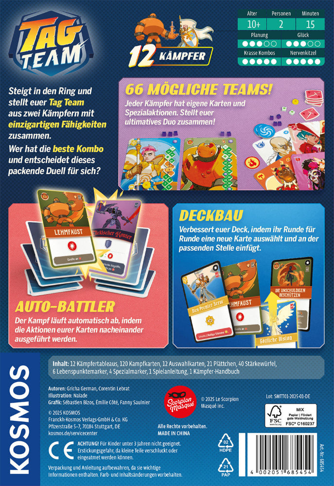 Im spannenden 2er-Deckbau-Spiel Tag Team stellen sich die beiden Spielerinnen und Spieler je ein Team aus zwei Kämpferinnen und Kämpfern mit unterschiedlichen Fähigkeiten zusammen. Mit deren kombinierten Kartendecks treten sie Runde für Runde gegeneinander an, indem immer die oberste Karte aufgedeckt und die Effekte ausgelöst werden.